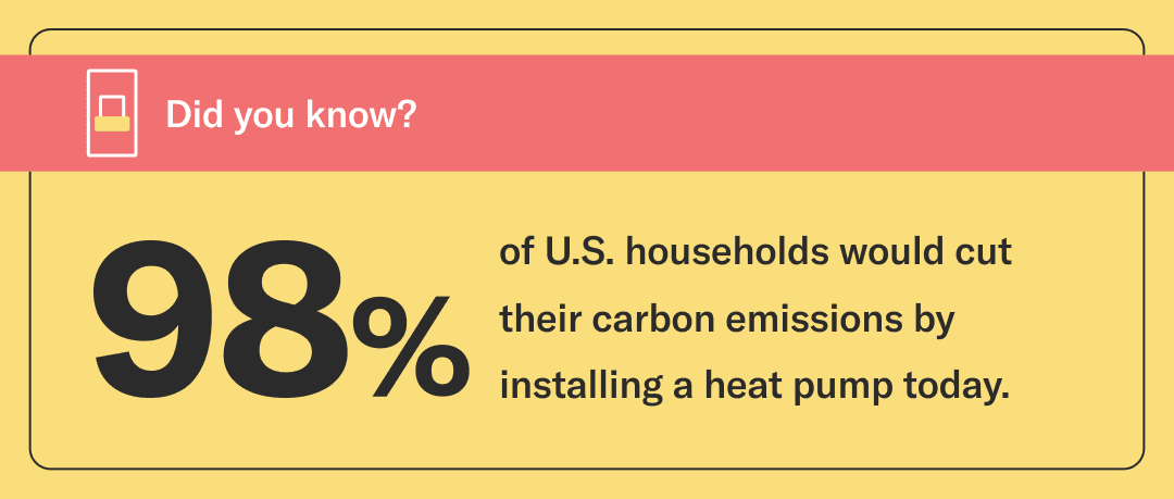 Heat pumps are the cleaner choice. Even under conservative DOE minimum efficiency standards and 100-year global warming potentials, 98% of U.S. households would cut their carbon emissions by installing a heat pump. If all single family homes in the U.S. adopted heat pumps, the total annual emissions reduction would be at least 160 million metric tonnes by 2032.